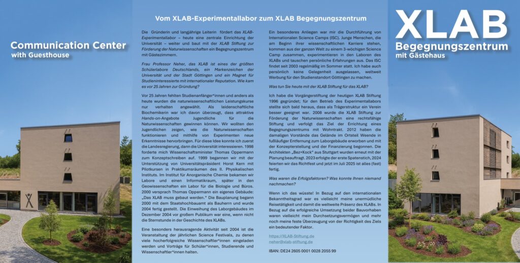 Für die Realisierung eines Begegnungszentrums mit Wohntrakt in Campusnähe hätte der Platz nicht günstiger sein können. Öffentliche Mittel vom Niedersächsischen Ministerium für Wissenschaft und Kultur und vom Bundesministerium für Bildung und Forschung konnten erfolgreich beantragt werden. Die XLAB Stiftung hat beachtliche Summen von privaten Förderern einwerben können und ist dafür außerordentlich dankbar. Sorge bereitet natürlich die im Moment nicht kalkulierbare Entwicklung der Bauwirtschaft. Voller Erwartung werden wir im März 2023 mit dem ersten Spatenstich das Bauvorhaben beginnen.